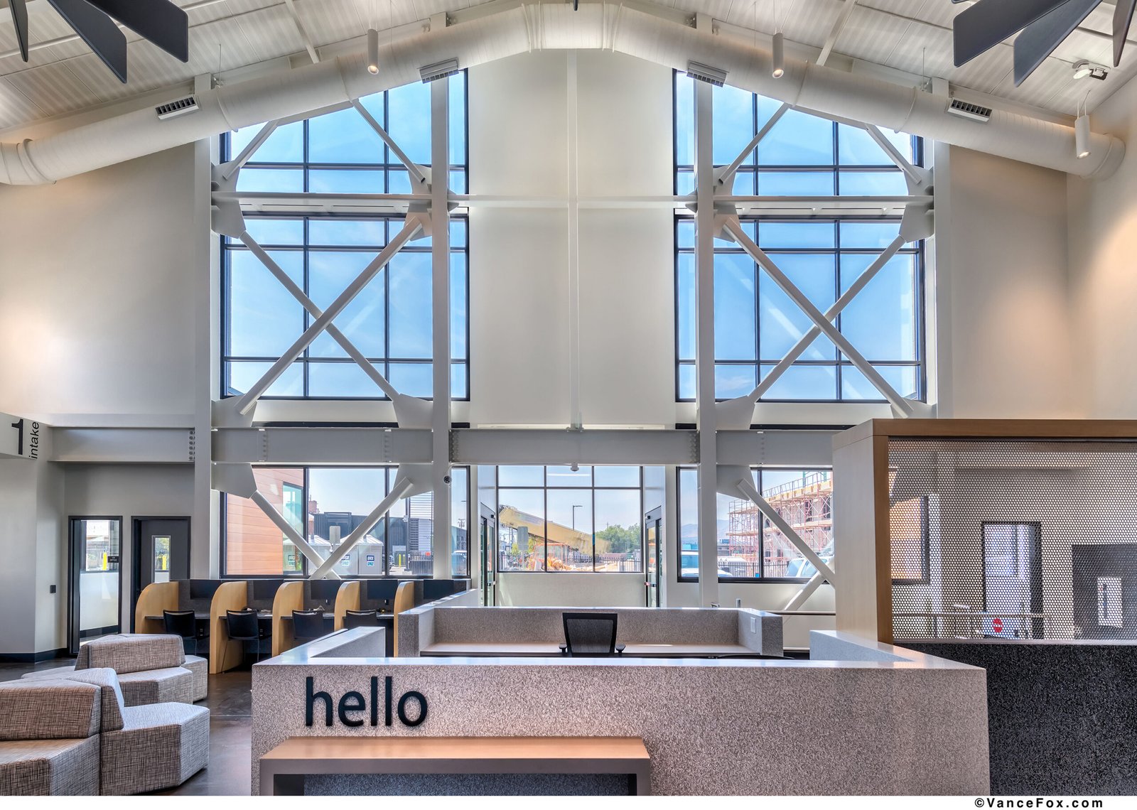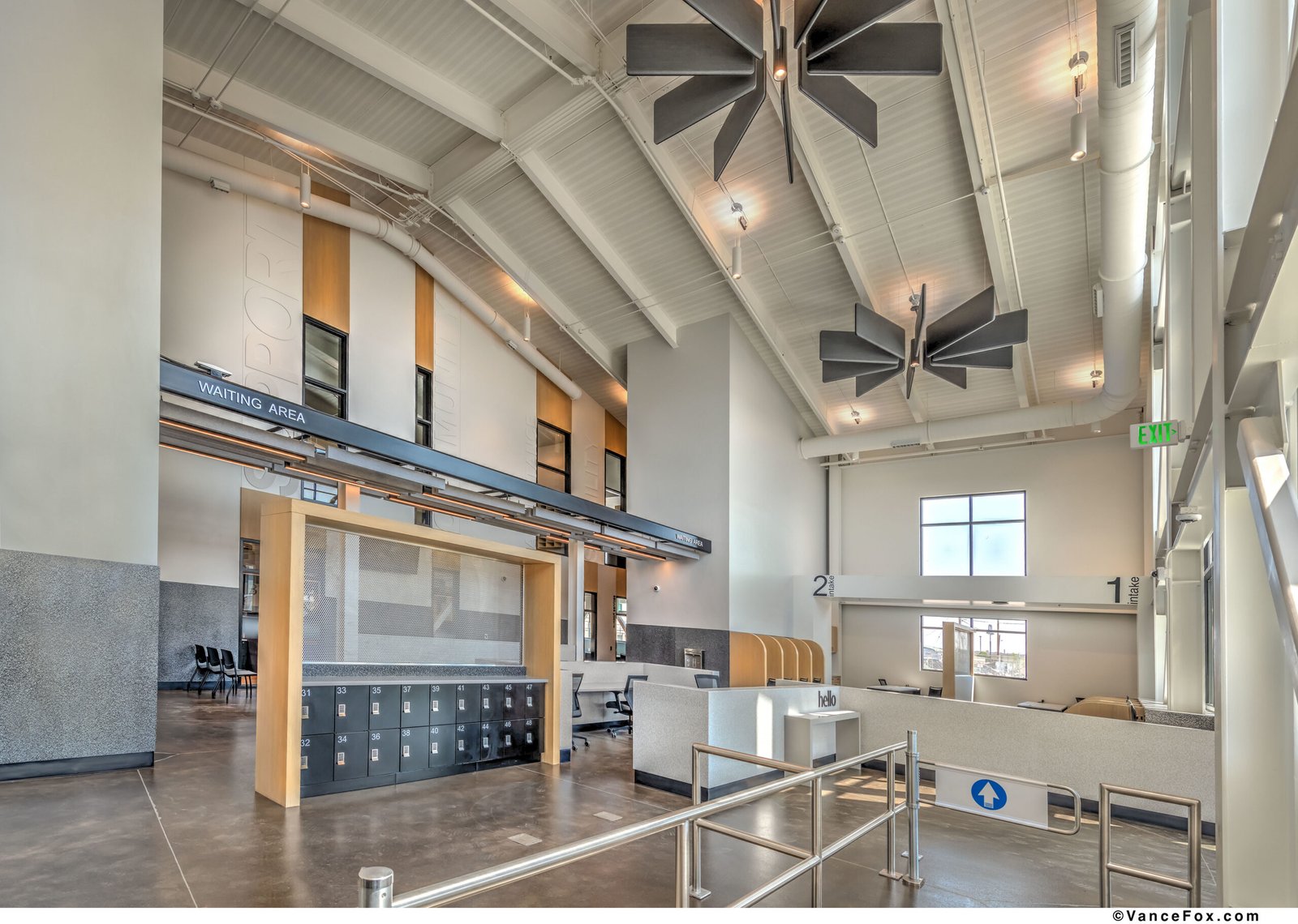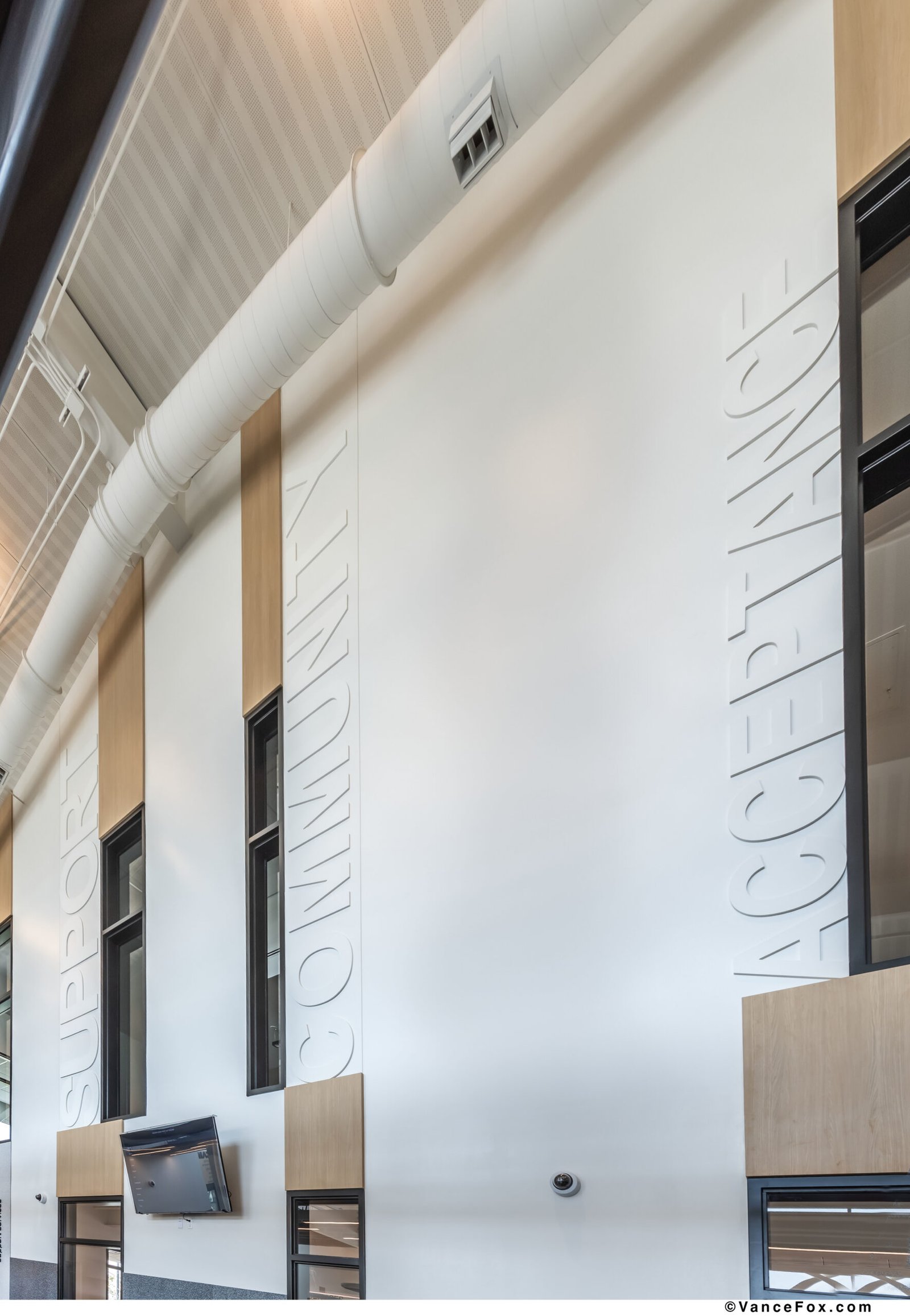 Durable materials—concrete masonry, steel, and metal panels—were selected for their longevity and minimal maintenance. Interiors use resilient flooring, sealed concrete, and acoustic surfaces that withstand constant wear. The design achieves character through proportion, light, and color rather than costly finishes.