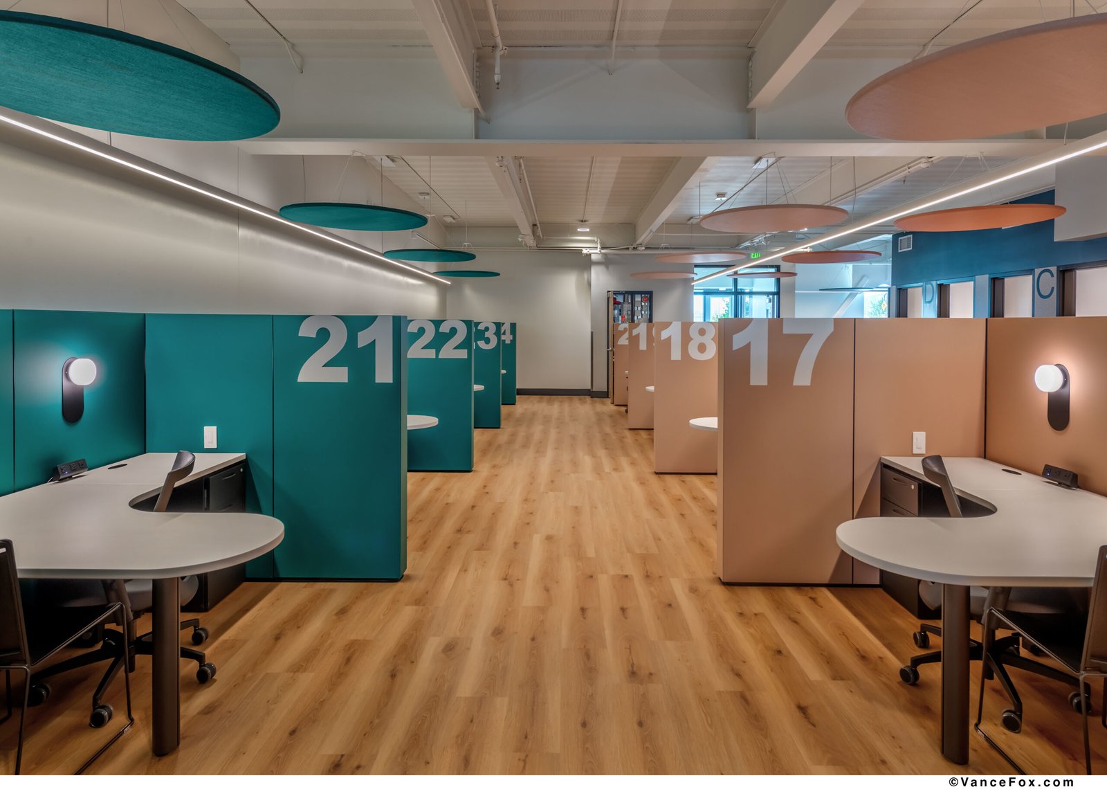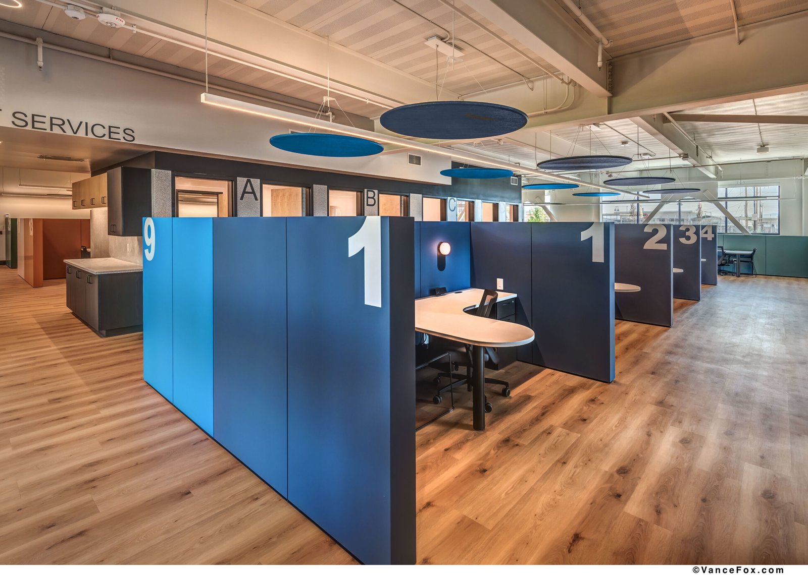 Delivered in phases, the campus evolved from a single emergency shelter into a complete system of care. The first phase reorganized a sprung structure into sleeping areas defined by modular cubbies—simple, repeatable elements that offered privacy and acoustic comfort while preserving staff oversight. Distinct color zones and numbered cubbies organize spaces visually and acoustically, replacing anonymity with individuality. In tandem was permanent restroom and laundry buildings, and a transformed existing metal storage building into a day-use resource center. Followed by a new Welcome Center for intake and counseling. The final phase adds supportive housing units, completing the journey from crisis shelter to long-term stability.