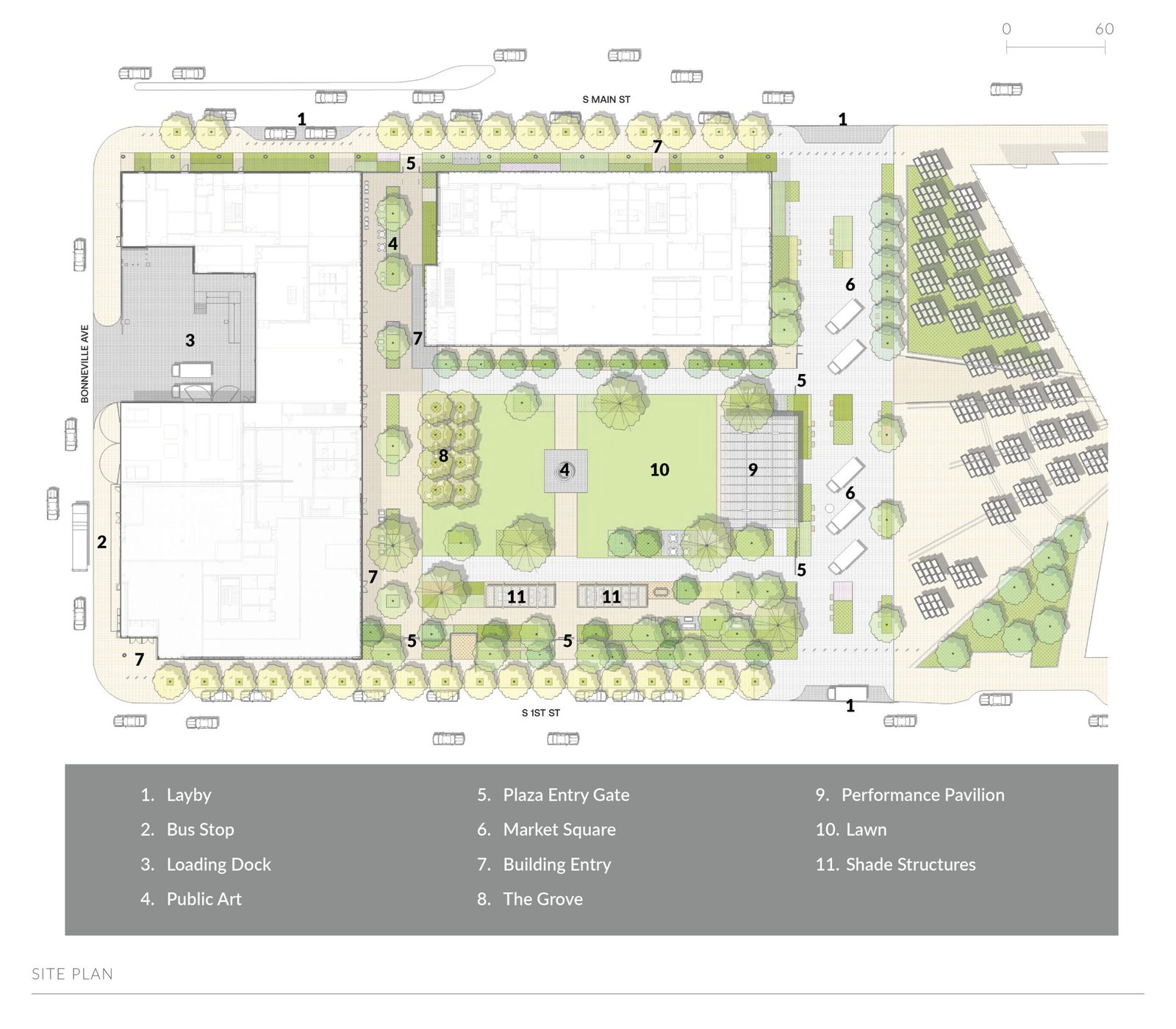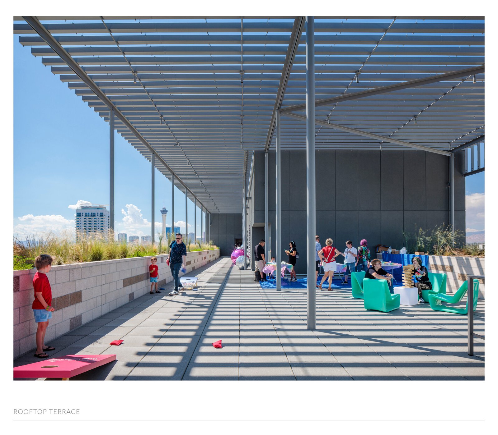 The new $190 million Downtown Civic Center Building and Plaza transforms two city blocks in the heart of downtown Las Vegas into a vibrant civic destination. The design unites more than 1,000 city employees across multiple departments into a single connected campus while creating a community plaza that redefines the city’s civic identity. The project is both a workplace and a gathering space—an accessible, inclusive, and sustainable anchor for the growing civic district. Located on a 2.5-acre parcel south of City Hall, the project establishes a physical and visual connection among key downtown institutions, including the Municipal Court, Clark County Government Center, and the Regional Justice Center. The site also links the Arts District and Symphony Park to the Fremont Street corridor through a network of shaded pedestrian routes, transit stops, and open spaces that encourage walkability and social engagement. The Civic Center comprises two mixed-use office towers totaling over 250,000 square feet. The five-story west tower houses city operations, while the four-story east tower offers leasable space for civic and private tenants, reinforcing the downtown ecosystem. Between them, the new plaza becomes the connective tissue—a civic living room that supports daily interaction and large-scale events alike. The massing strategy—“Municipal Campus / Plaza / Porosity”—balances density and openness. The towers frame the plaza, while terraced voids and landscaped decks create visual and physical permeability between indoor and outdoor spaces. Two second-level terraces link directly to office environments, allowing workspaces to spill outdoors. The rooftop terrace provides sweeping views of the mountains and desert valley, reinforcing a sense of place and connecting civic life to the regional landscape. At the ground plane, the public plaza forms an integral part of the design, accommodating up to 4,500 people for concerts, markets, festivals, and civic celebrations. A performance pavilion anchors the space, complemented by a flexible lawn and tree-lined promenade. The design emphasizes porosity and safety, with clear sightlines across the site, multiple entries, and layered vantage points from balconies and terraces above. These spatial connections enhance comfort, visibility, and inclusivity while extending activity throughout the day and into evening hours. Public art defines the character of the Civic Center. Two major sculptures anchor the plaza—one by Cliff Garten Studio and another by local artist Krystal Ramirez. Inside, four commissioned artists—most of them from the surrounding community—created original works that reflect the city’s culture and civic spirit. Sustainability and resilience are woven throughout the design. Shading devices, native landscaping, and high-performance glazing mitigate desert heat and reduce energy demand. The material palette—stone, metal, and glass—embodies durability and transparency, aligning with the project’s civic purpose. With its completion, the Downtown Civic Center and Plaza stand as the symbolic and physical heart of the city: an interconnected campus where government, art, and public life converge. The project transforms an underutilized site into a porous, inclusive, and enduring framework for civic engagement—one that celebrates both people and place.