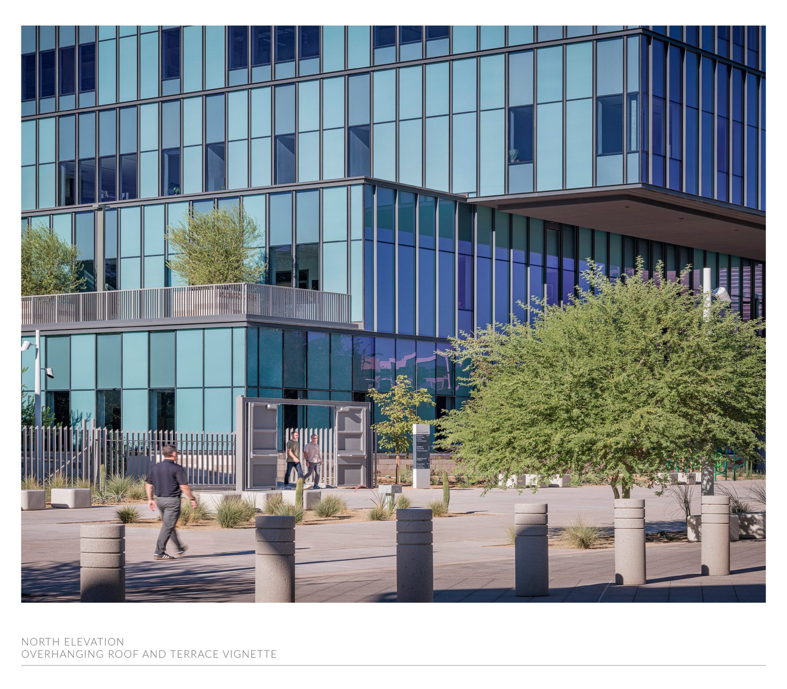 Sustainability in the Downtown Civic Center is rooted in environmental performance, efficiency, and community connectivity. The design integrates passive strategies, energy reduction, and responsible material choices to achieve civic and environmental goals while catalyzing downtown revitalization and setting a new standard for desert urbanism. High-efficiency air-cooled chillers and low-power LED lighting minimize energy use. Combined with the City’s renewable energy portfolio, the building is positioned for net-zero performance—achieving a 62% EUI reduction below the 2030 baseline with Tier 2 renewables. Building orientation shades the central plaza, while a high-performance envelope with optimized glazing balances daylight and thermal performance to enhance comfort and reduce artificial lighting. Connection to nature drives the experience: vegetated terraces and rooftop decks extend public space outward and upward, offering views across the Las Vegas Valley. Native, drought-tolerant landscapes minimize water use and mitigate heat-island effects through shaded areas, tree canopies, and light-colored paving. Transit adjacency, walkable linkages, and bicycle-friendly routes support sustainable mobility. Regionally sourced, durable materials with high recycled content reduce embodied carbon. The result is a civic campus that exemplifies environmental stewardship and operational efficiency—demonstrating how thoughtful, performance-based design can flourish within the desert climate of downtown Las Vegas.