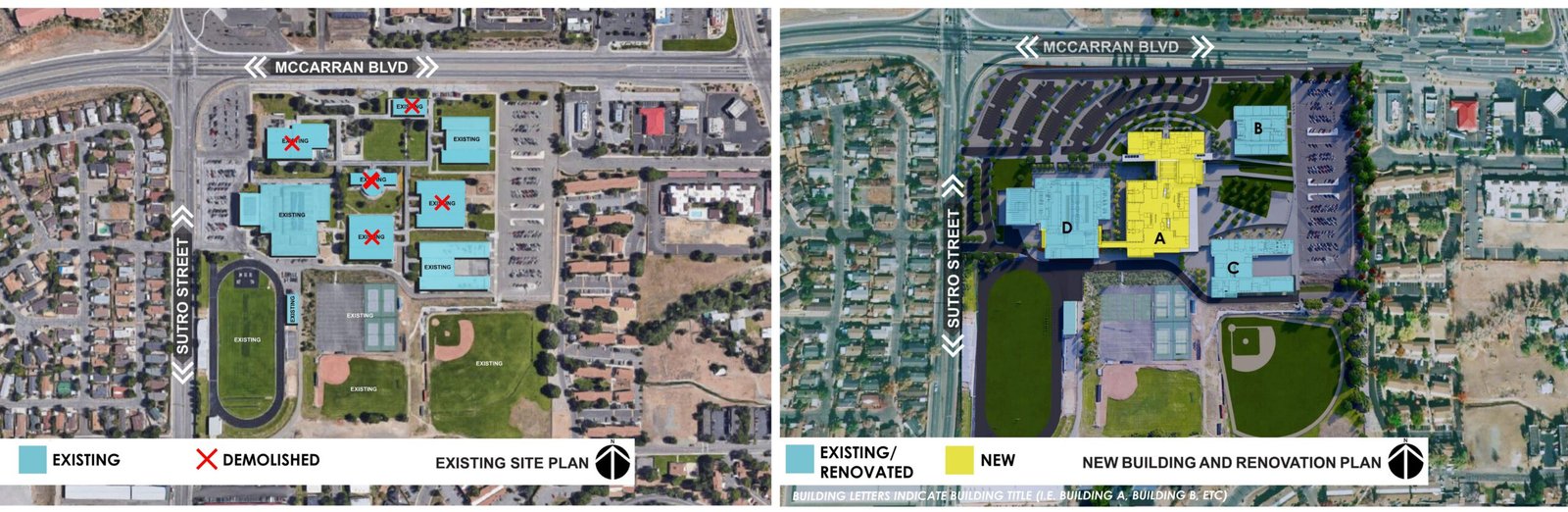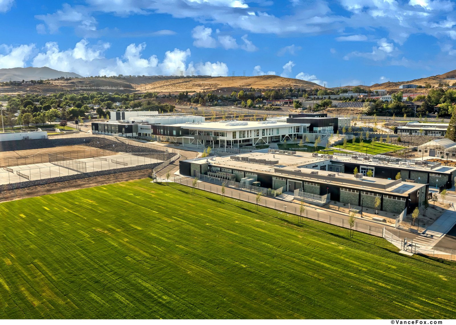 The Debbie Smith Career and Technical Education Academy transforms an aging campus of 8 buildings into a cohesive new campus for a new generation of learning. Designed for the Washoe County School District, the 224,000-square-foot campus merges 121,000 square feet of adaptive reuse with 103,000 square feet of new construction, uniting past and future within a single, legible framework. The Owner determined that only 5 of the 8 individual existing buildings would be demolished. With that, the design addresses a 40’ differential in site slope from single point entrance to sport fields while also acting as a connector between the remaining (3) existing buildings. This provides the “Connective” element for the new collaborative education environment for this Technical academy. A new two-story academic building anchors the 37-acre site, linking existing structures through plazas, terraces, and covered outdoor spaces that invite collaboration and connection. The architecture expresses the school’s mission — to elevate hands-on learning — through transparency, exposure, and authenticity. Programs ranging from Biomedicine to Construction, from Culinary Arts to Digital Media, are brought into visual dialogue, celebrating the breadth of human skill. Here, structure and spirit align: daylight reveals process, materials speak of craft, and every space teaches through its making.
