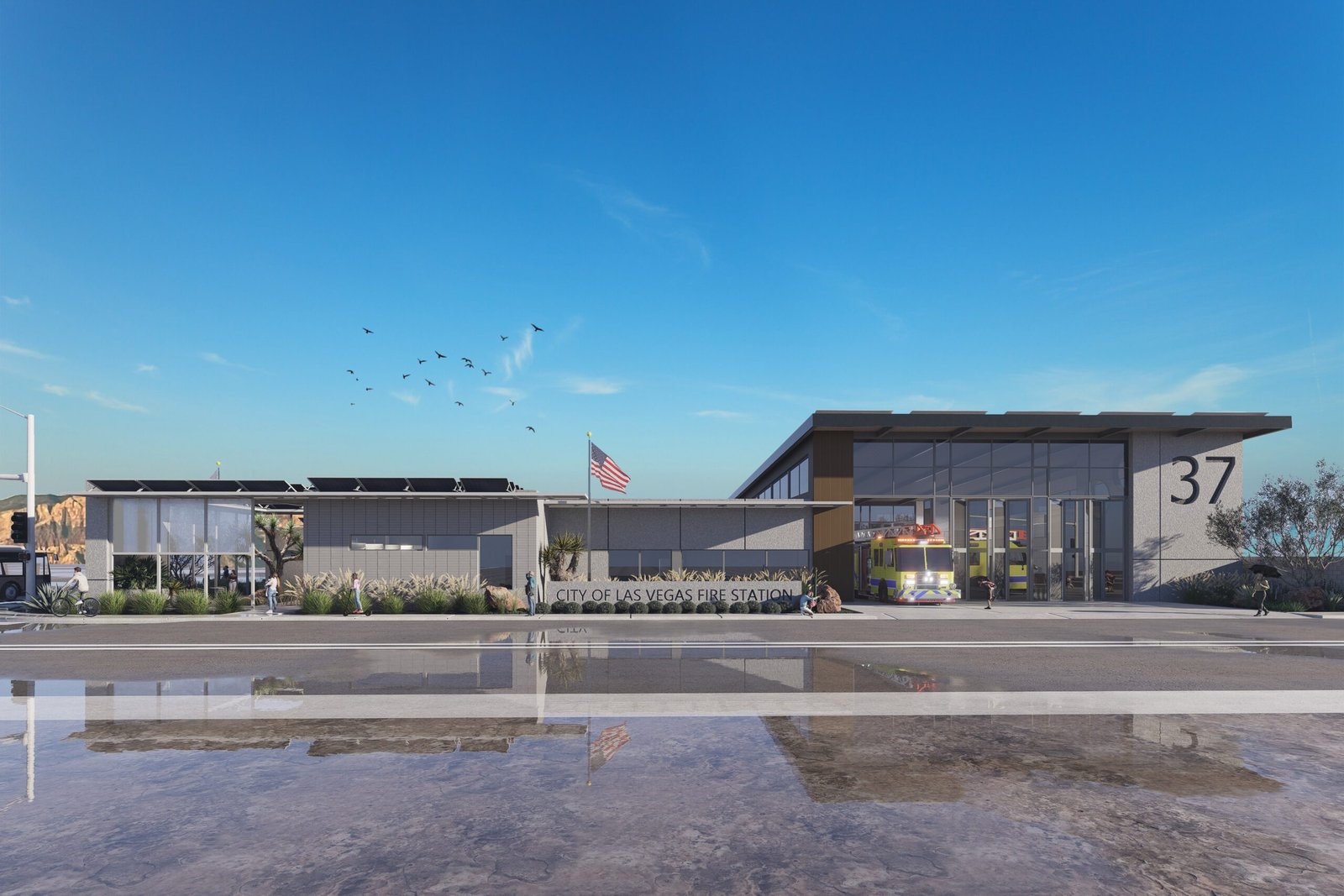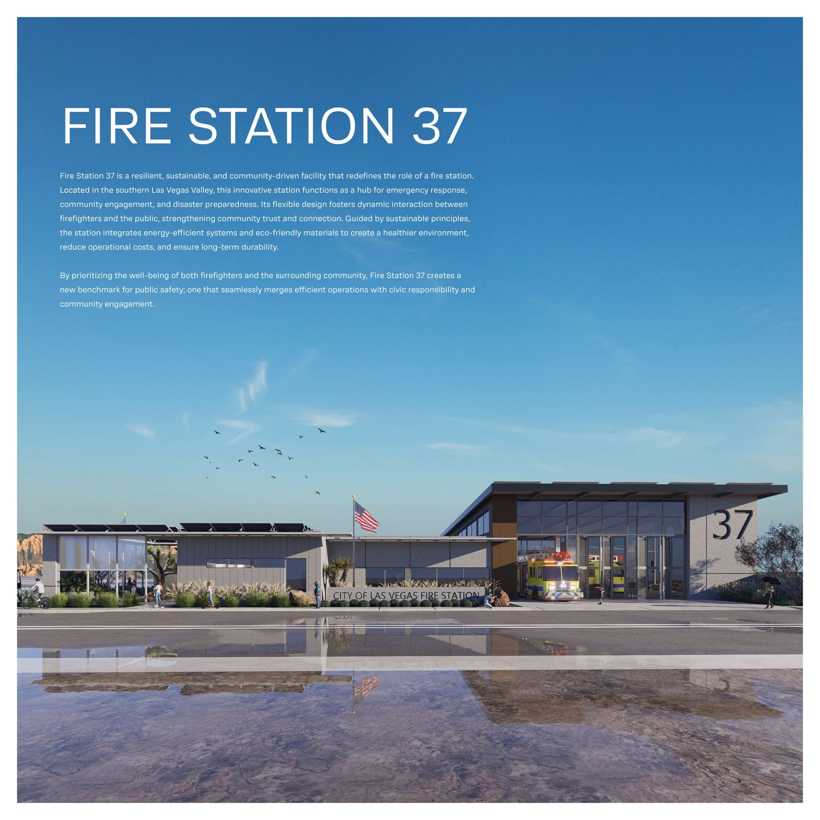 By prioritizing the well-being of both firefighters and the community, Fire Station 37 sets a new standard for intertwining public safety and community service while reinforcing the surrounding neighborhoods with opportunity. Fire Station 37 is a resilient, sustainable, and community-driven facility that redefines the role of a fire station. Located in the southern Las Vegas Valley, this innovative station functions as a hub for emergency response, community engagement, and disaster preparedness. Its flexible design fosters dynamic interaction between firefighters and the public, strengthening community trust and connection. Guided by sustainable principles, the station integrates energy-efficient systems and eco-friendly materials to create a healthier environment, reduce operational costs, and ensure long-term durability. An integrated bus stop enhances accessibility and promotes public transportation, further connecting the station to the neighborhood it serves. By prioritizing the well-being of both firefighters and the surrounding community, Fire Station 37 creates a new benchmark for public safety; one that seamlessly merges efficient operations with civic responsibility and community engagement.