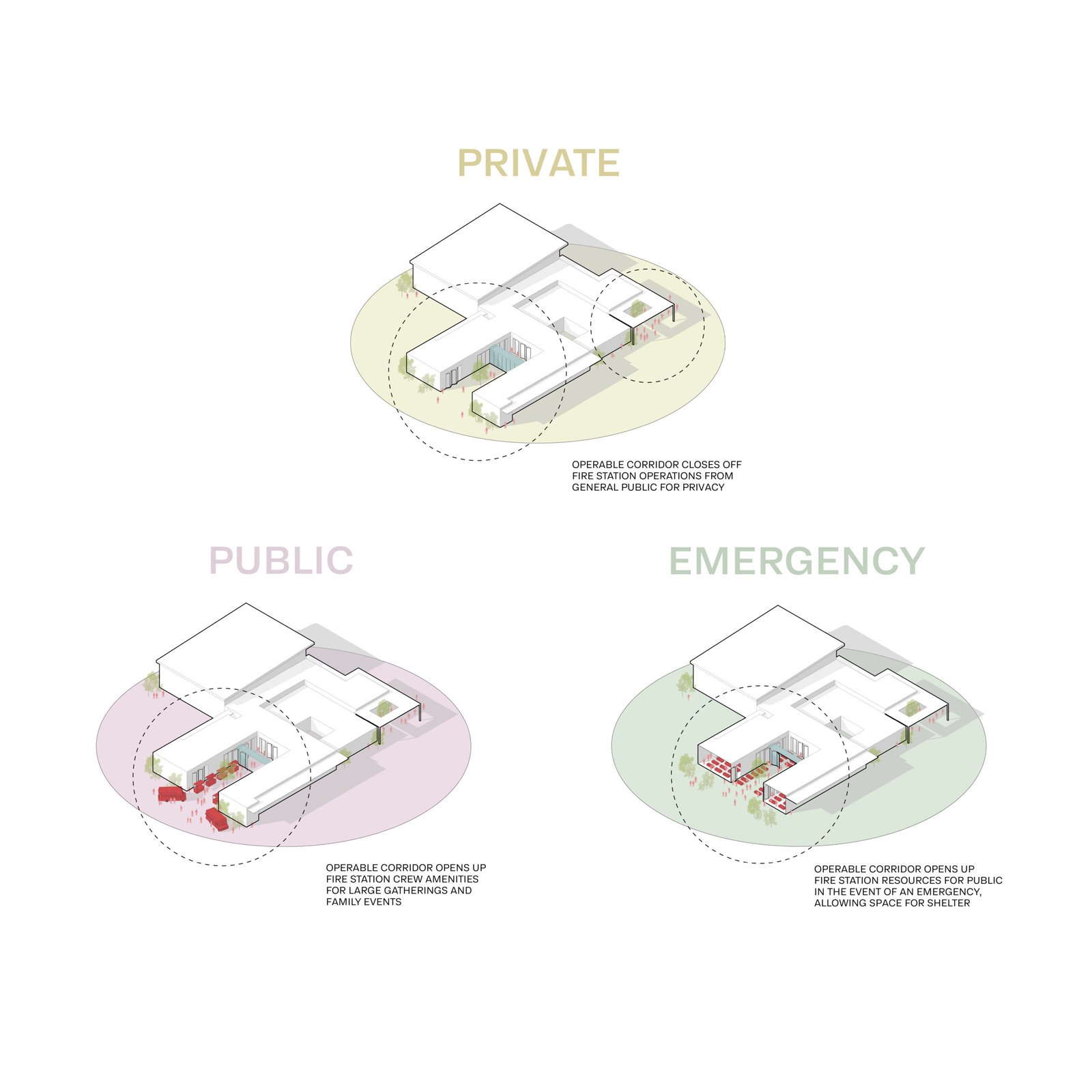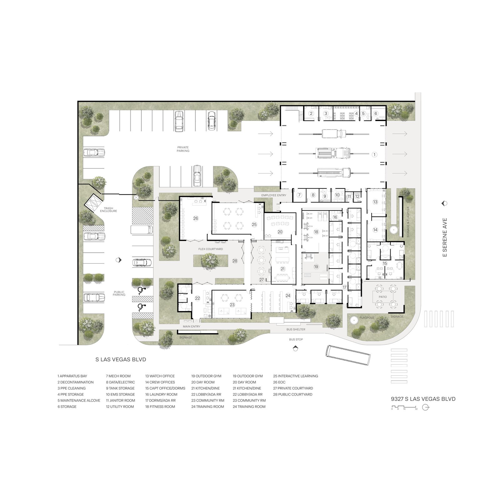 Fire Station 37 redefines the role of a safety facility by embedding a community center within a fully operational fire station. Located in the southern Las Vegas Valley, the project responds to the city’s growing need for resilient infrastructure that supports both emergency services and meaningful community engagement. As the surrounding area continues to develop, the station acts not only as a critical first-response hub but also as a social anchor that connects residents through education, preparedness, and collective resilience. The design prioritizes flexibility, adaptability, and connection. A central operable corridor anchors the station, functioning as a shared artery for circulation, gatherings, and community events. This space extends outward into a centralized courtyard, which links the Emergency Operations Center (EOC), fire safety operations, and public zones. The courtyard serves as the project’s heart—an adaptable outdoor room that can transform into a temporary shelter during disasters, offering shaded relief, power, and resources generated through the EOC’s solar storage system. The EOC itself functions as both a command center and a community resource, capable of powering essential operations independently in the event of an outage. The space houses ample storage for bedding, clothing, and other resources. The EOC emphasizes the project’s mission: to serve the community in both wellness efforts and emergency conditions. The plan carefully intertwines public and private zones, balancing firefighter needs for privacy, safety, and separating public programming from decontamination areas. Community amenities are provided with open spaces designed for public education, engagement, determined circulation paths, and visual transparency. These elements clearly define zones while maintaining a sense of openness and belonging. This approach allows the public to witness the activity and discipline of firefighting while ensuring safety and operational integrity. Responding to the site’s urban and environmental context, the building incorporates an integrated bus stop along its facade to improve accessibility and support public transit options. The station’s orientation optimizes natural daylight and solar gain through north-facing service zones that receive soft, controlled light, while the south-facing courtyard benefits from adjustable shading through perforated metal panels. These passive strategies reduce energy consumption and create comfort throughout the site. Materiality plays a key role in expressing the building’s identity. The design draws inspiration from the surrounding desert landscape, balancing permanence and lightness through a palette of CMU brick, fiber cement, perforated metal screens, and box rib metal panels. This composition provides durability and low maintenance while reflecting the tones and textures of the Nevada desert. The use of perforation and layering allows light to paint the facade throughout the day, embodying a sense of transparency and adaptability. Fire Station 37 ultimately serves as a symbol of preparedness, unity, and sustainability. By integrating renewable energy systems, flexible programmatic zones, and community-focused design principles, the project sets a new standard for public safety architecture… one that bridges the gap between protection and participation, resilience and connection, function and identity.