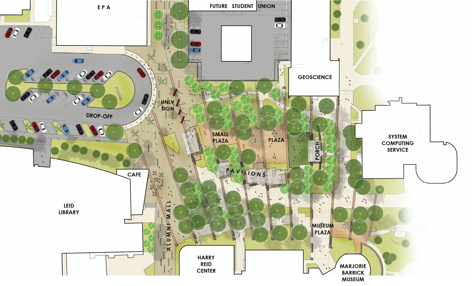gathering point for small or large groups. The design includes: a new campus arrival where visitors can express their UNLV pride; a series of
