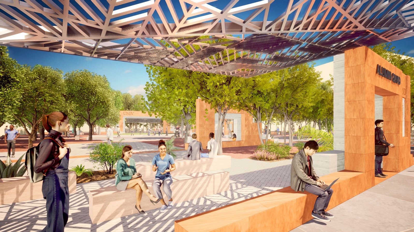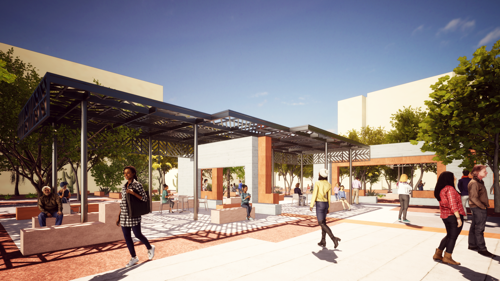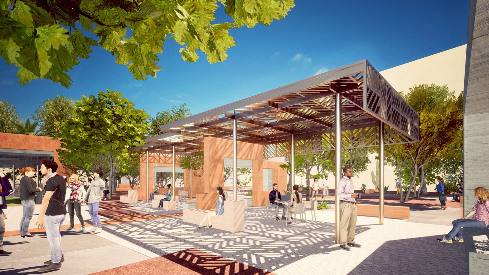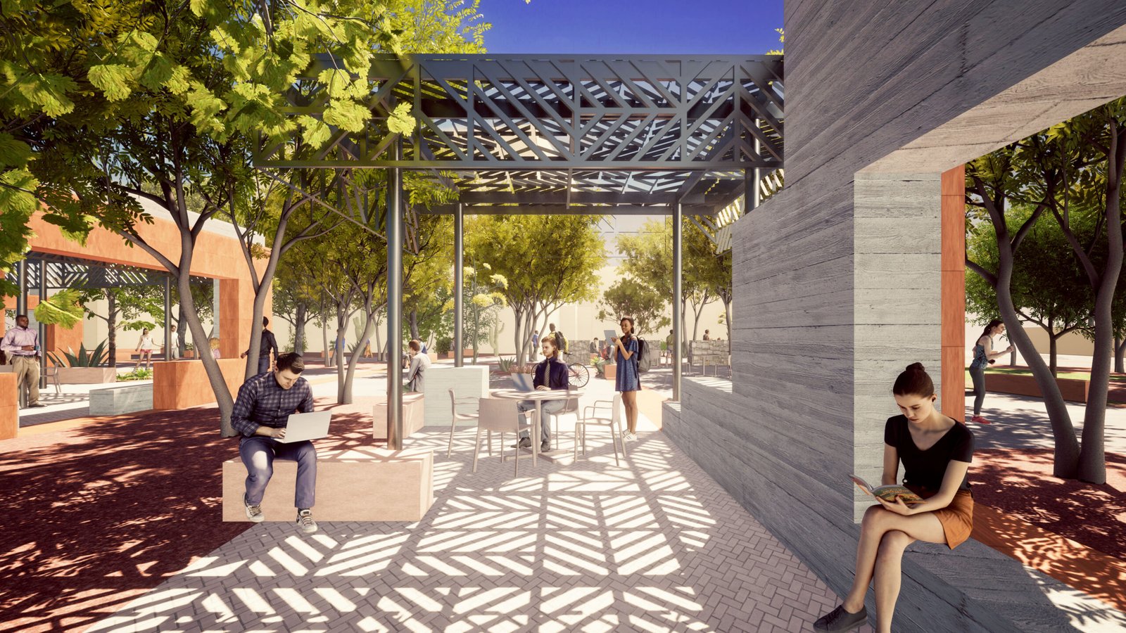 A rich palette of indigenous materials, colors, and plants inspires the design and feel of Heart of Campus to reflect the vitality of the region. Use of local materials (sandstone, rammed earth) reduces shipping impact while plantings add tree canopy and soften the angular buildings. The shade pavilions seen here are cool respites for students with the lighter color palette naturally reflecting sunlight rather than absorbing it.