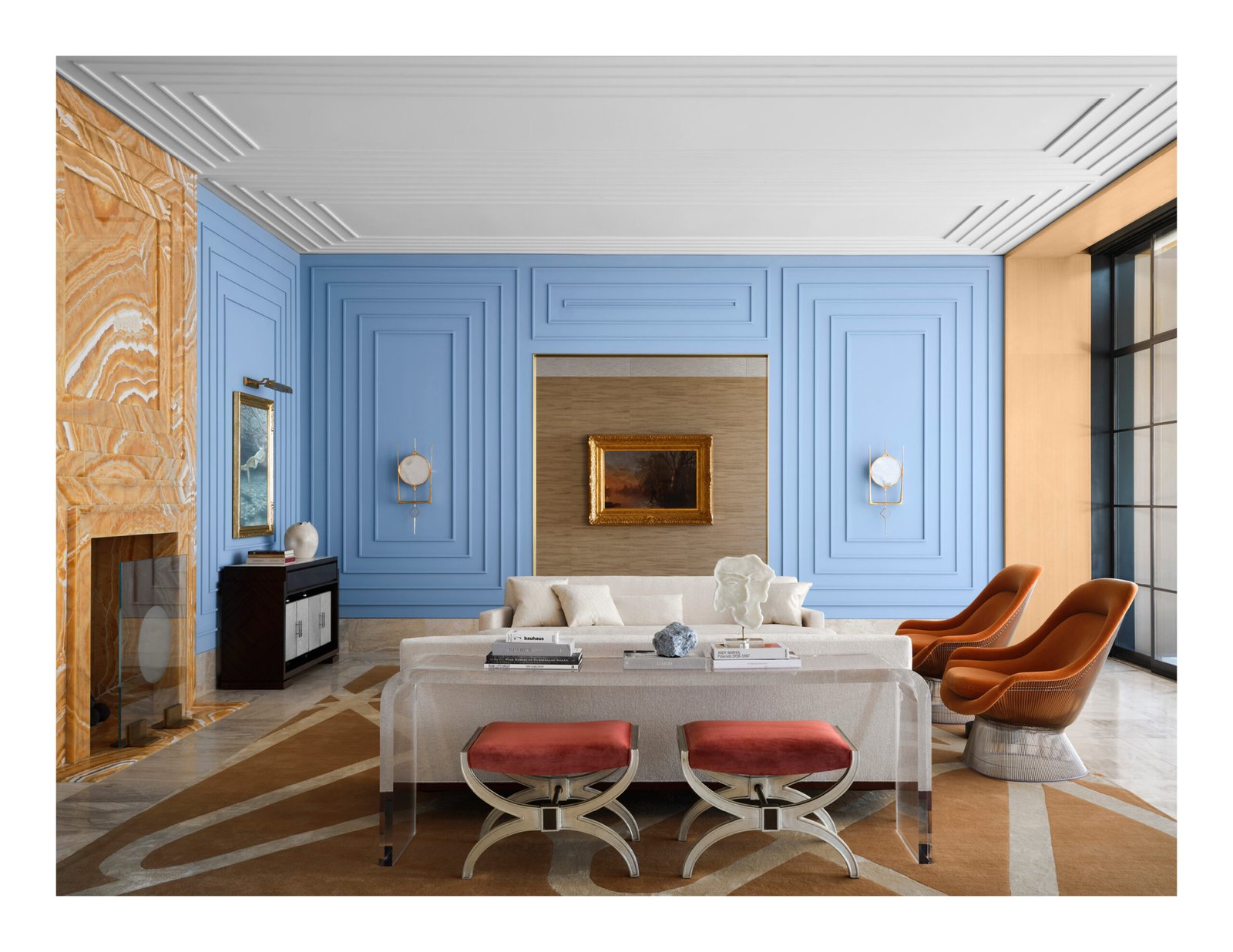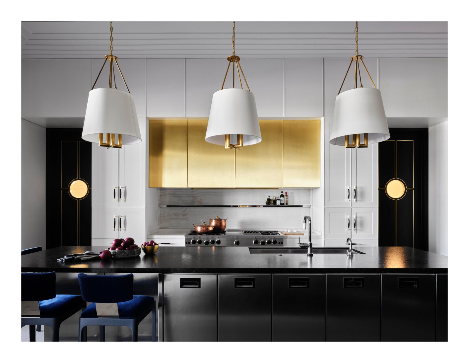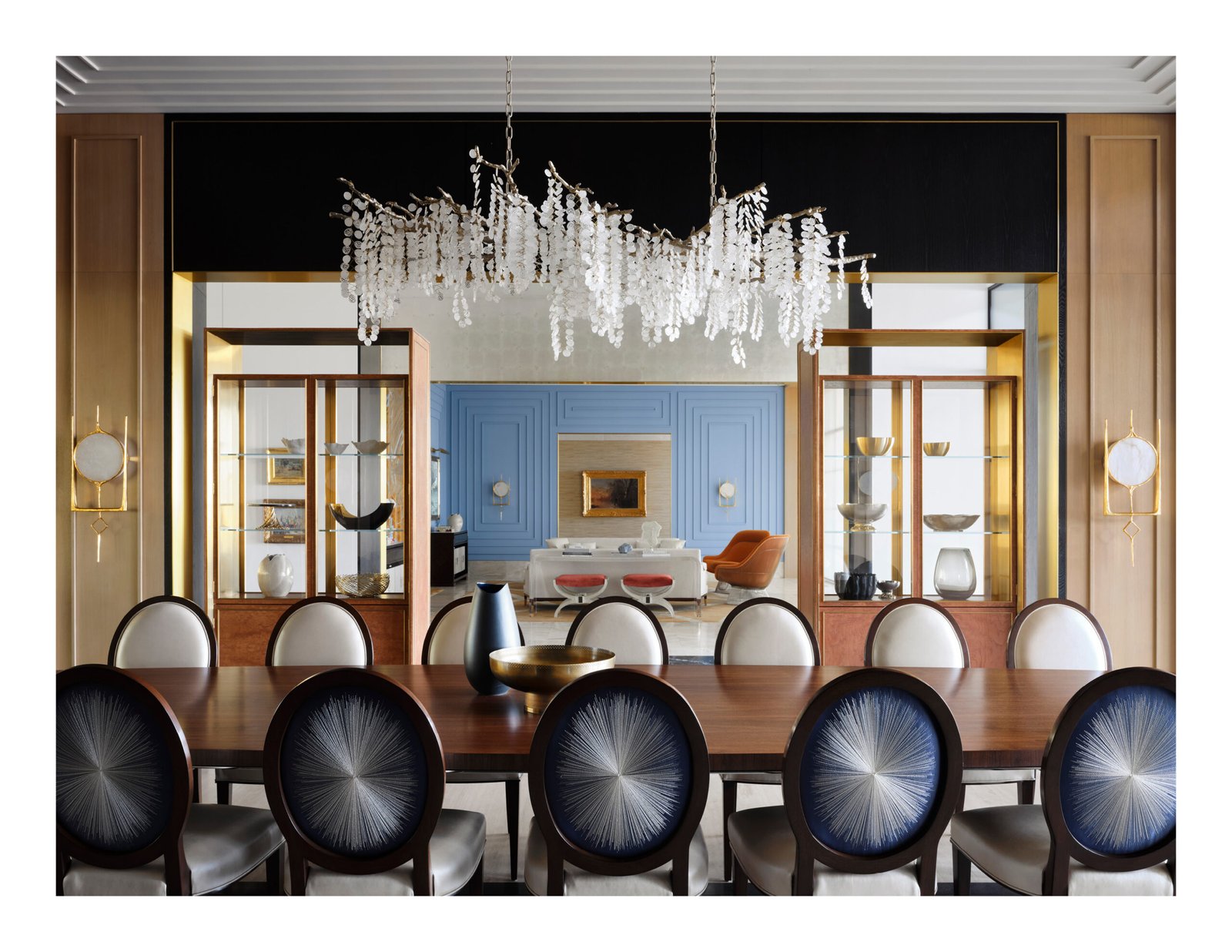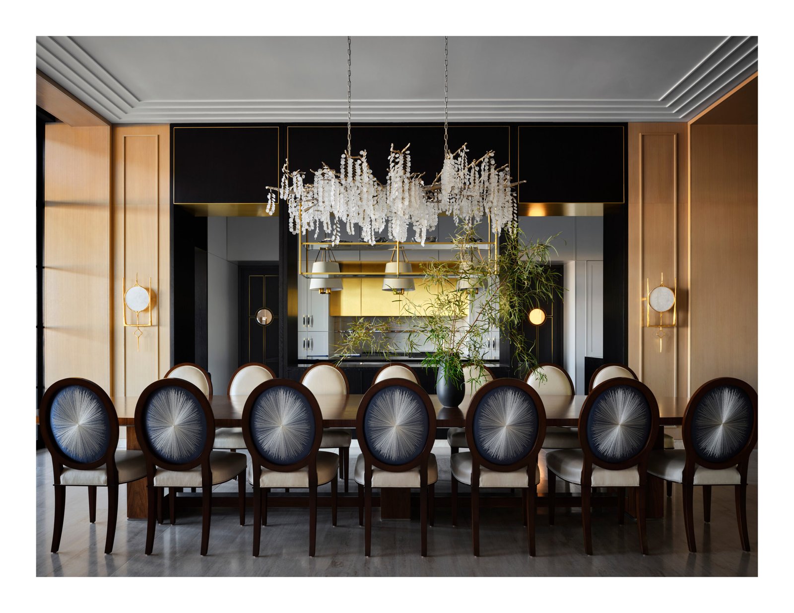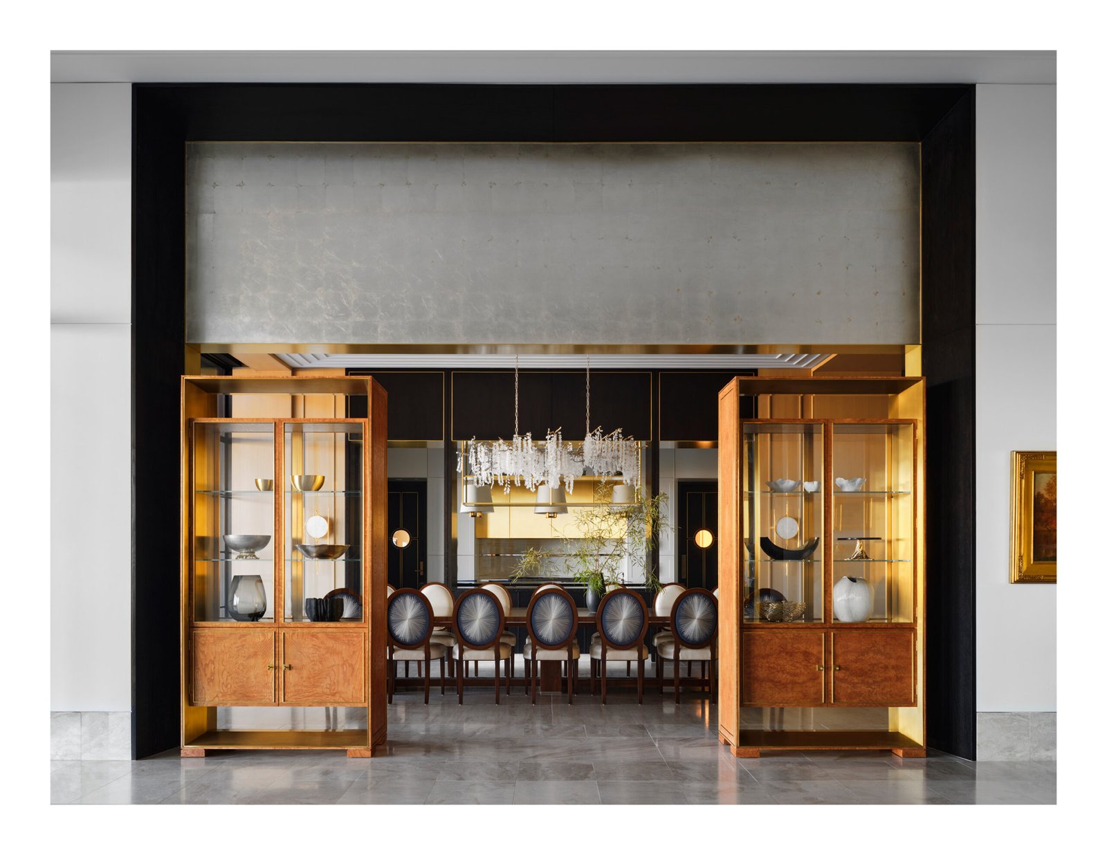 Designed from a cinematic approach, various themes unfold in the house, beginning with a concept borrowed from the owners’ collection of “Hudson River School” paintings. Drawing inspiration not only from the expansive landscape vistas the mid-19th-century American art movement was known for, but also from the gilded frames that anchor and define the artwork within; the primary design concept of “portals” that layer and frame rooms emerged. Thus, creating a curated experience that serves as a framed backdrop to life’s daily activities as they unfold.