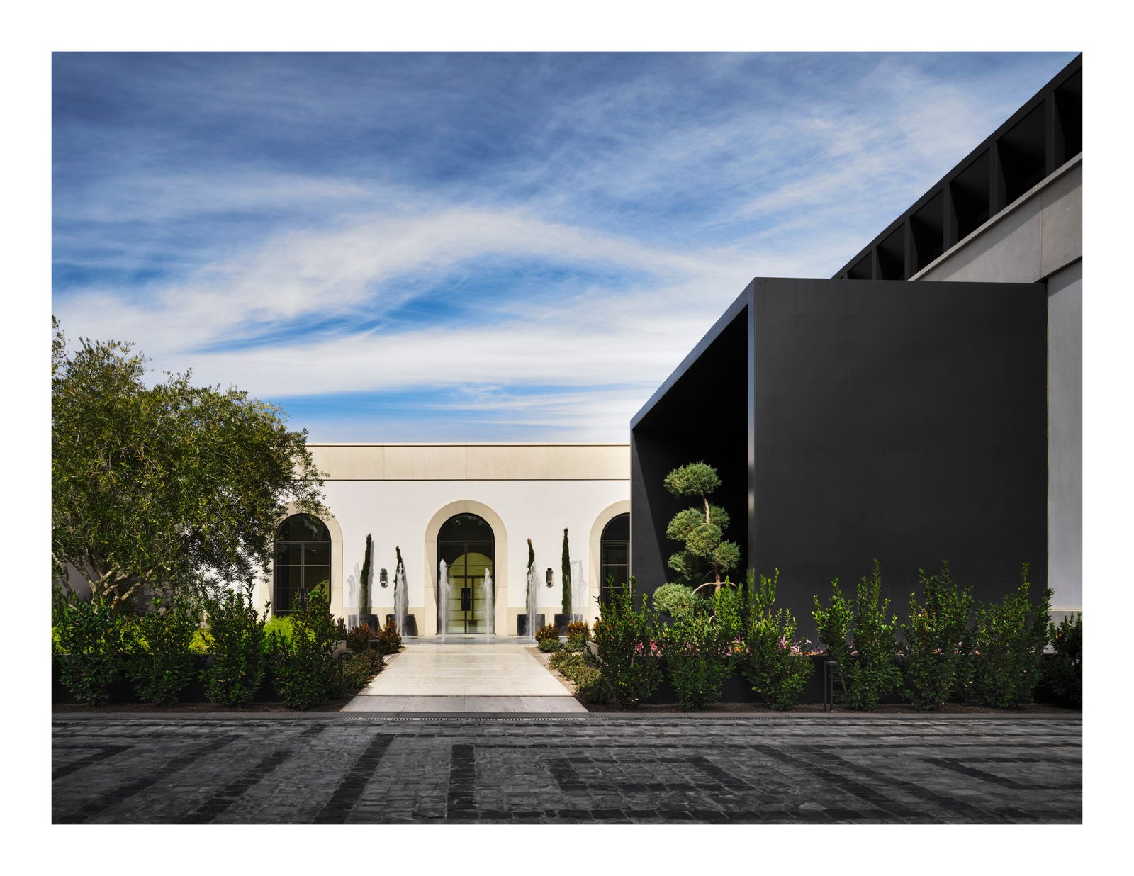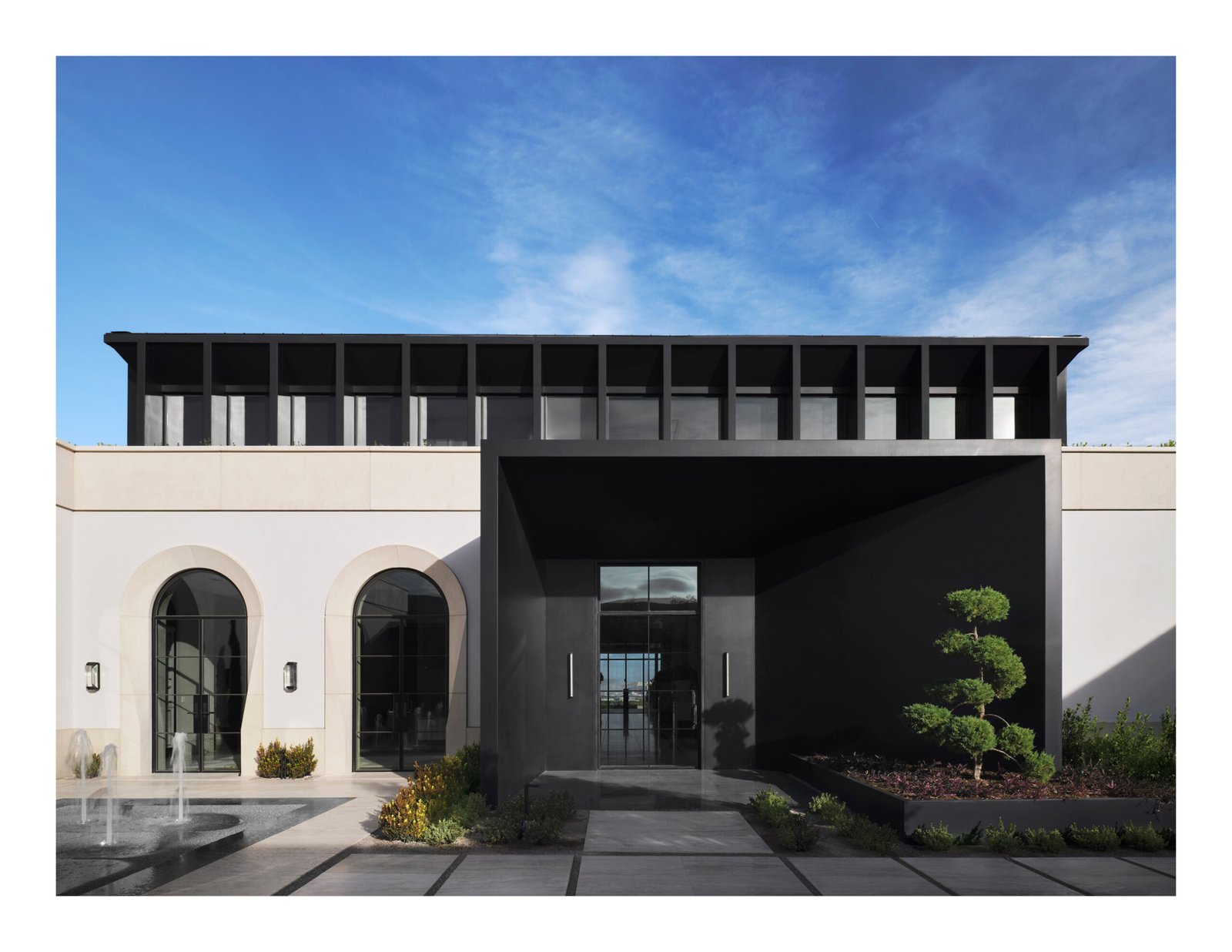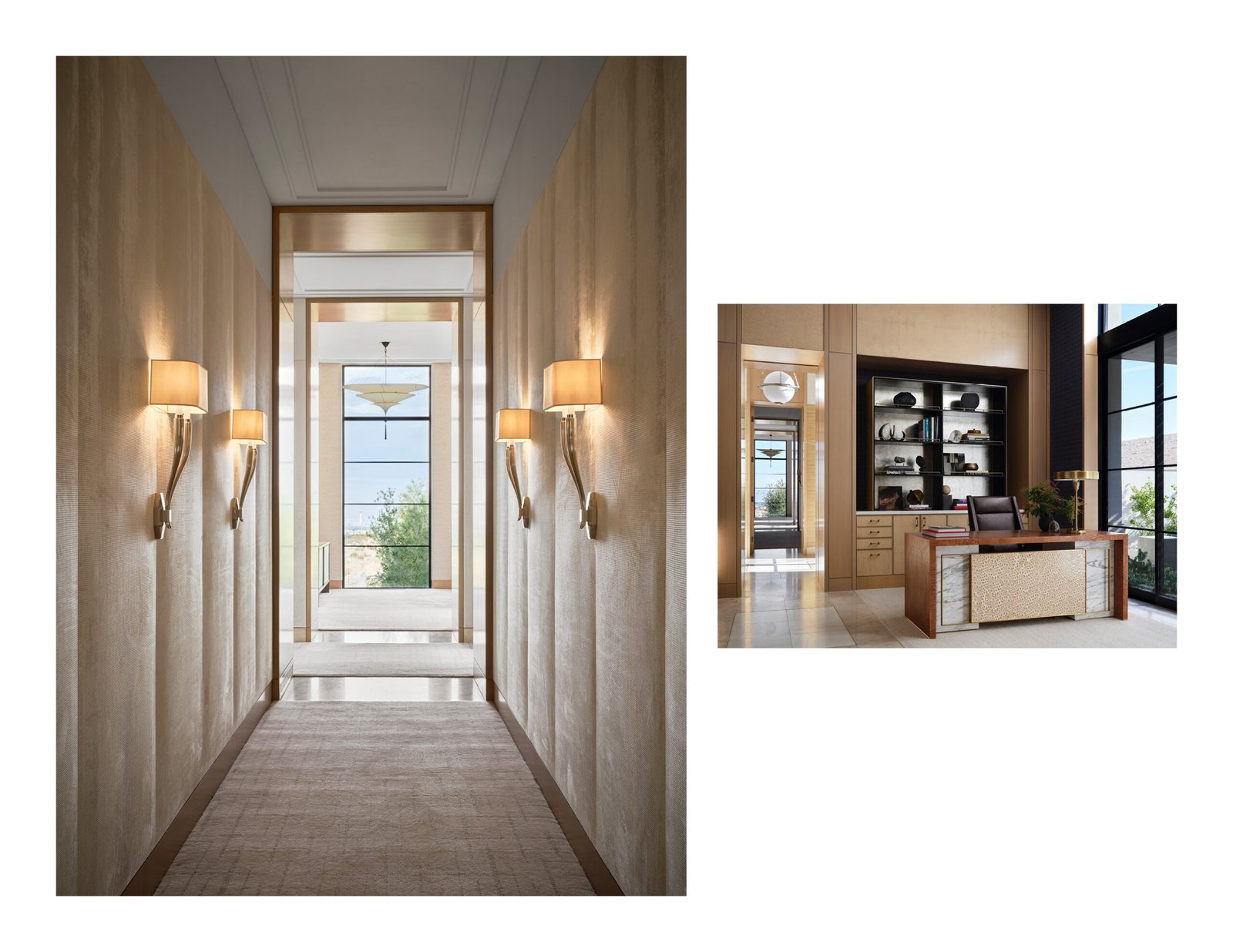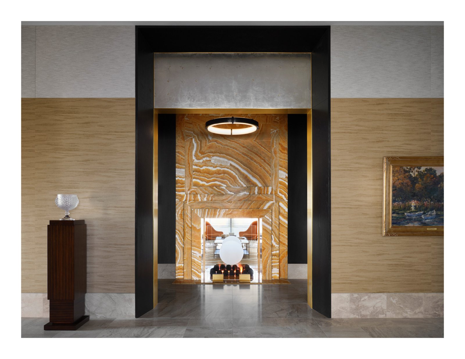 Moving inward to the arrival courtyard a level of classical formality is juxtaposed by a starkly modern entry volume clad in steel. Through this first framed portal, the gallery, which serves as the central circulation spine, bone colored marble flooring with a dark border and onyx insets delineate the path of circulation, inviting guests to move through the series of spaces connected by frames. At each end of the corridor, cast concrete archways prominently frame connections to the exterior, visually terminating with the skyline beyond.