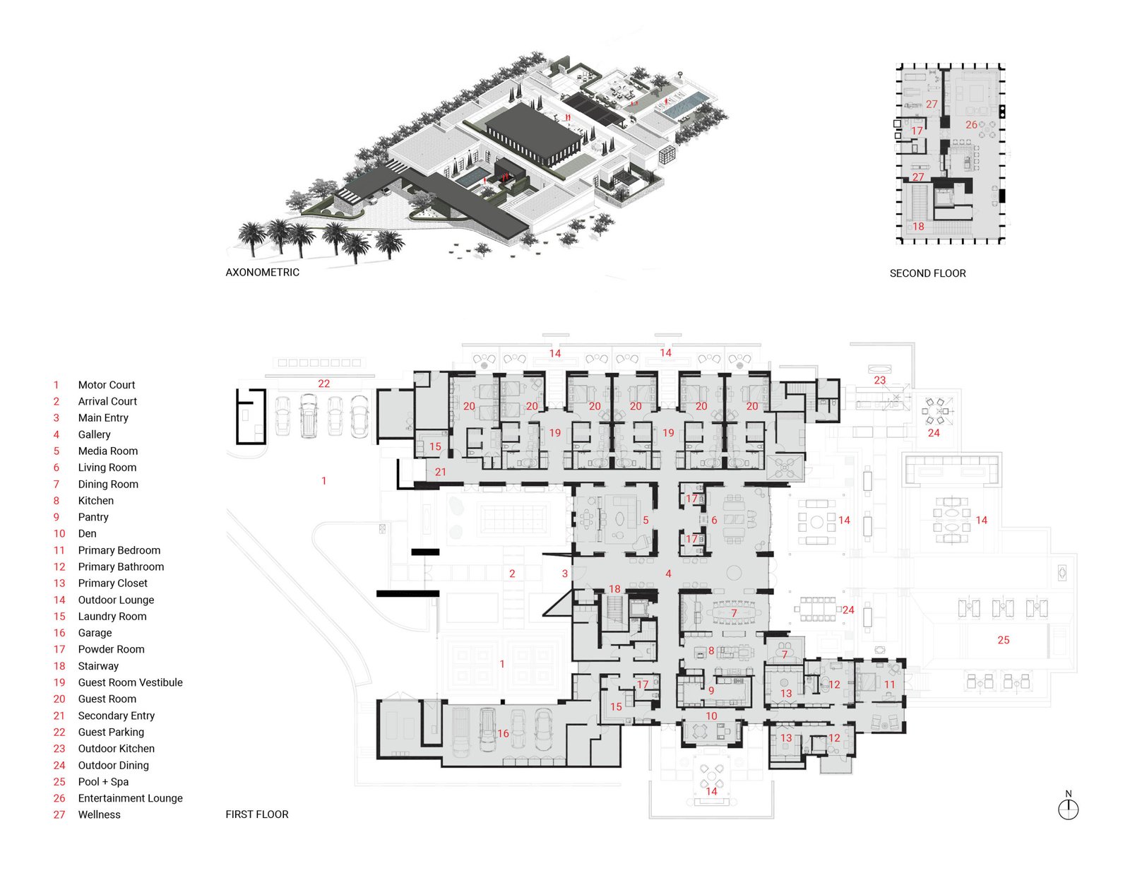 The spatial organization of an H-shaped plan breaks down the scale of the home to create livable and discoverable environments. Branching off from the central gallery, a cluster of gathering spaces at the center of the home includes a media room, a formal living room, a dining room with kitchen beyond, and a grand stairwell leading to the upper-level entertainment lounge. A perpendicular corridor located at the very center of the interior presents a crossroads connecting the opposing private and guest wings.