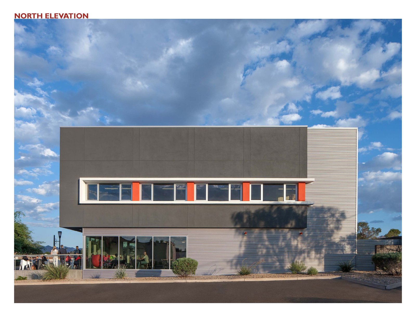 The project phasing occurred over 5-years due to the developer’s incremental financing based on multiple city grants and land acquisitions. The commercial building is 11,000sf and 2-stories. It addresses the street with massing that provides a direct connection for the coffee shop and allows pedestrians to see activity within the building. The architecture is modern and human scaled to fit within the neighborhood. The materials are straight forward, utilizing finishes common to the region. The building massing is stepped to appear as two separate structures to reduce scale from the street and provide a forecourt in front of the offices that allow viewing of the two-story mural on the south façade. It also allows the flexibility to provide for future reorganization of the office and retail mix based on market demands.