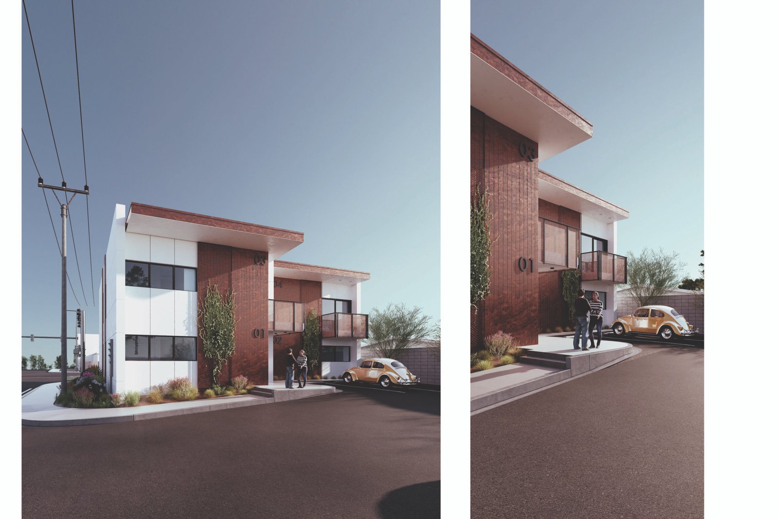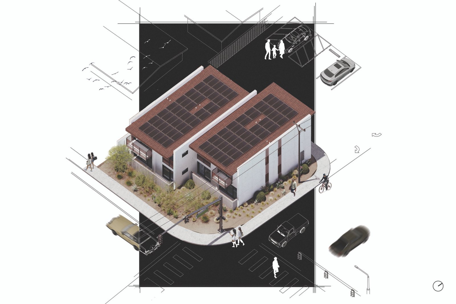 For the past several years, Las Vegas has found itself in an affordable housing crisis. As of 2025, there is an estimated shortage of fifty-eight thousand homes in the valley. In an attempt to (remedy) this, developers have continued to sprawl outward, pushing the limits of our valley’s buildable area. These attempts, however, are unaffordable to the working class, and without an adequate public transportation system in place, they are also inaccessible to those without a car. When we began The Weston, the goal was to create housing that would 1) be affordable and accessible to the area’s demographic, 2) promote a reasonable density that respects the existing vernacular, and 3) comply with the 2050 master plan as a part of the urban infill initiative. The existing context is an assortment of single-family homes, apartment complexes, and small local businesses. Taking cues from its neighborhood, The Weston aims to bridge the gap between single-family homes and dense apartment complexes by proposing a fourplex. This fourplex reimagines desert urban living by celebrating a healthy lifestyle through access to cross-ventilation, natural lighting, and inspirational views. Its location on a major transit line facilitates residents’ use of public transportation, providing access to nearby retail, dining, and entertainment. The design exemplifies a progressive shift towards a community-oriented, nature-centered lifestyle that enhances the overall character of the neighborhood.