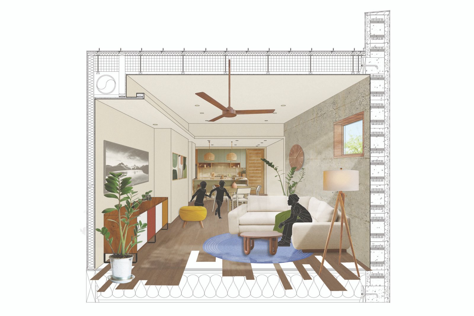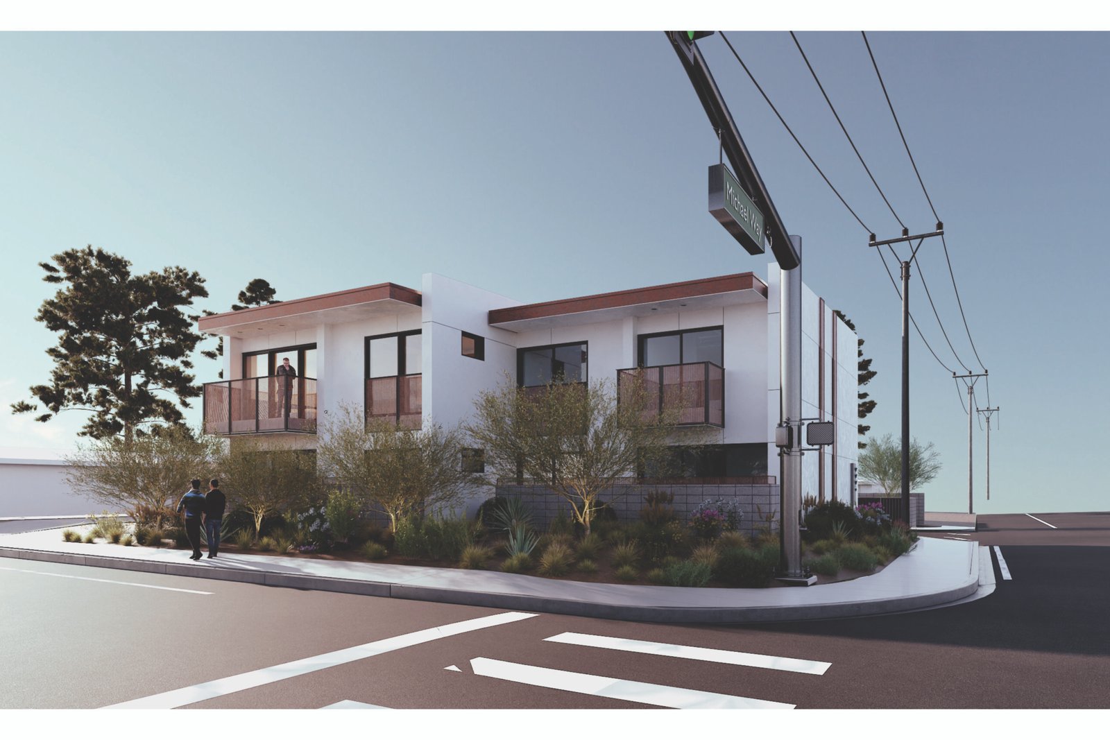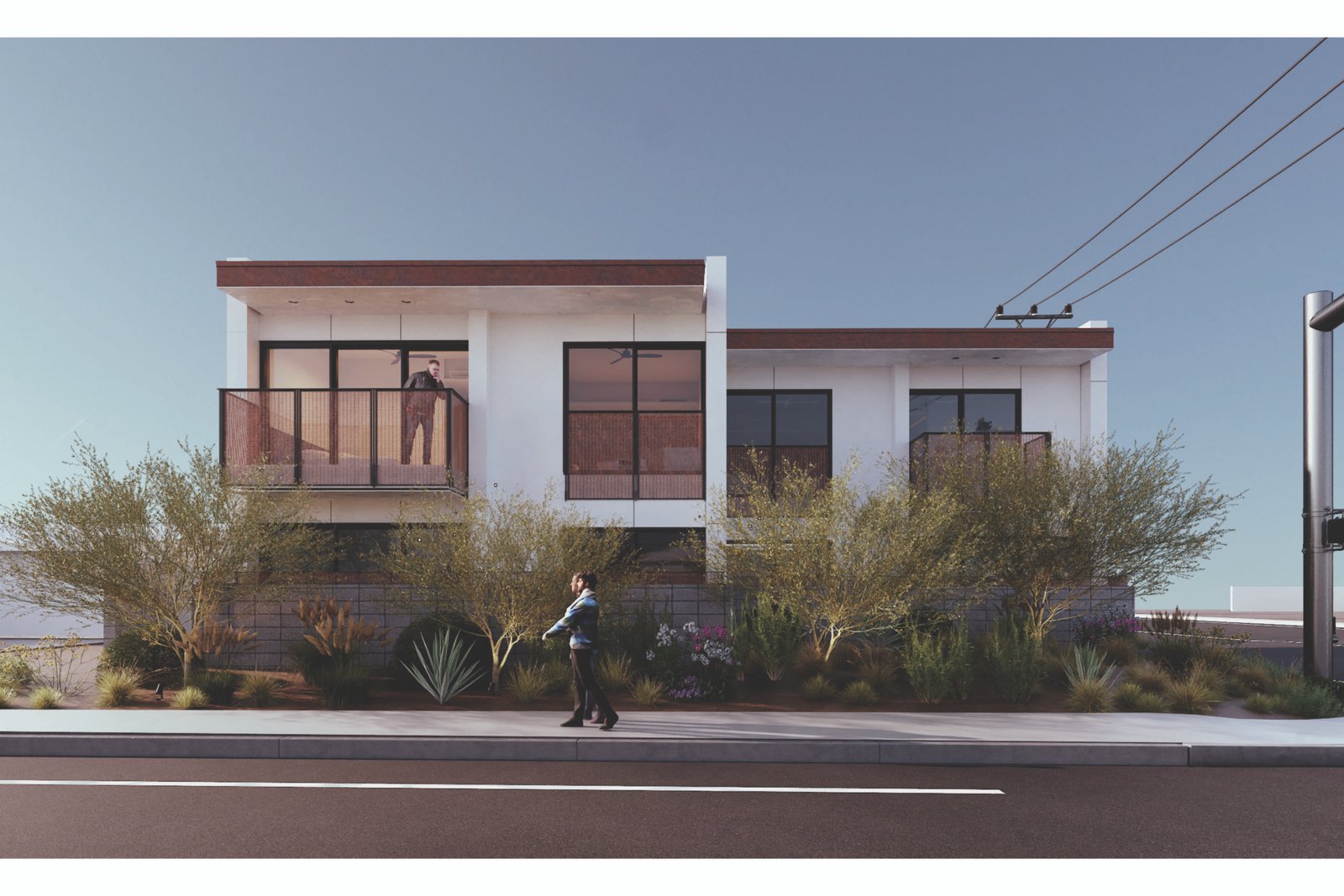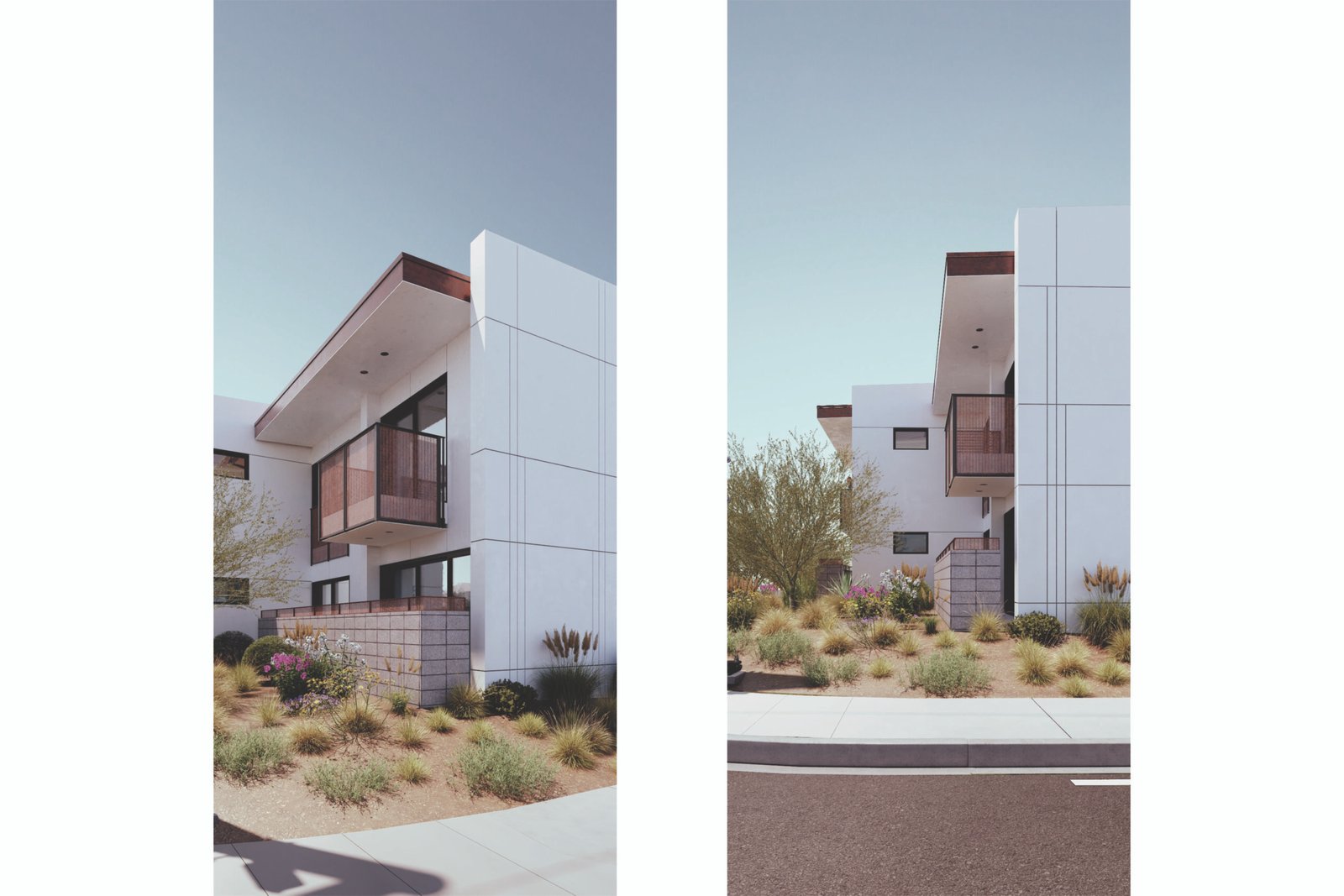 The Weston responds to the Mojave Desert by prioritizing passive cooling strategies. All of the exterior walls of the project are composed of Insulated Concrete Form (ICF) blocks to maximize energy efficiency and privacy between units. Efforts have been made to minimize material waste by utilizing the standard ICF block sizes to dictate wall heights, window locations, and wall configurations. Fenestration has been limited to the northern and southern facades to minimize energy loss during the pertinent summer months while permitting cross ventilation from the prevailing winds. The East and West-facing walls are 14” ICF, acting as thermal mass for the summer months.. Each window on the east and west facades is screened with a perforated metal screen to allow for filtered daylight and provide privacy from the streetscape. The exterior walls will be plastered in white stucco in order to maximize the albedo effect and reflect as much solar heat as possible. Large overhangs from the balconies and roofs aid in shading the south-facing windows. The roof’s area provides sufficient space to integrate photovoltaic panels and offset the residents’ energy consumption. The axial room layouts allow the users to cross-ventilate their homes as they see fit. On the second floor, the sloped ceilings provide a natural exhaust for warm air.