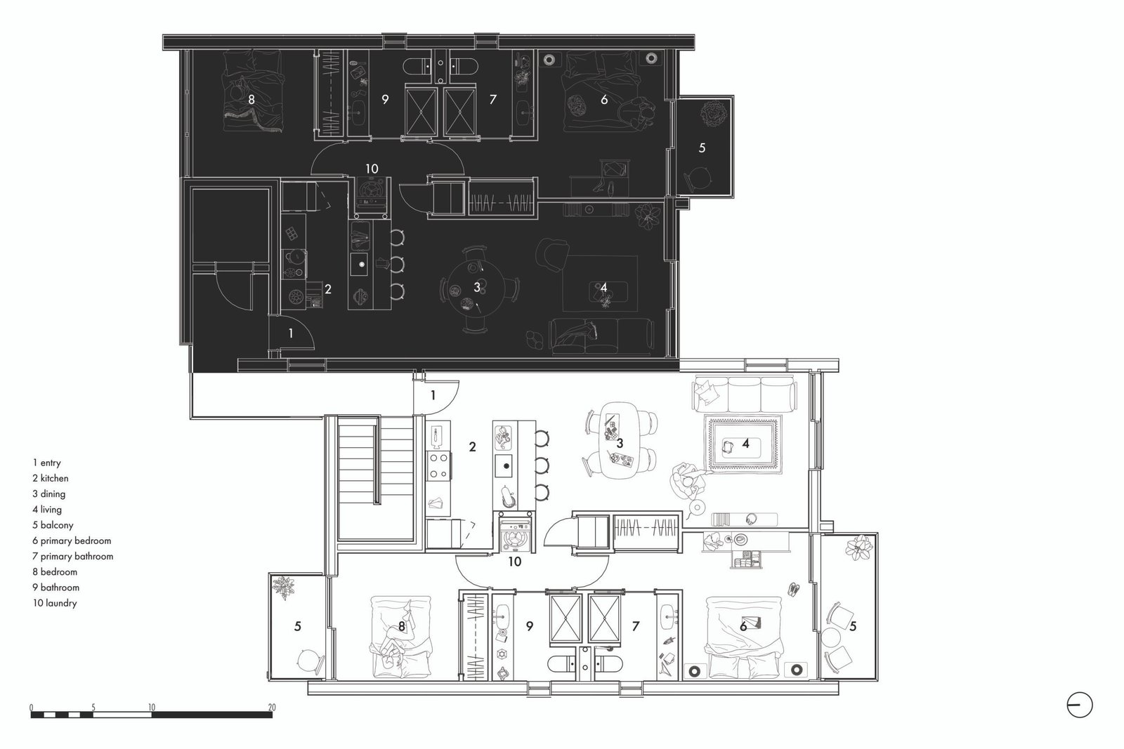 The median age of the neighborhood was in the mid-30s, with most households being 1 to 2 people. To best respond, each unit consists of 2 bedrooms, 2 bathrooms, a combined living-dining area, and a private outdoor space. Despite the lot’s limited size, we felt that access