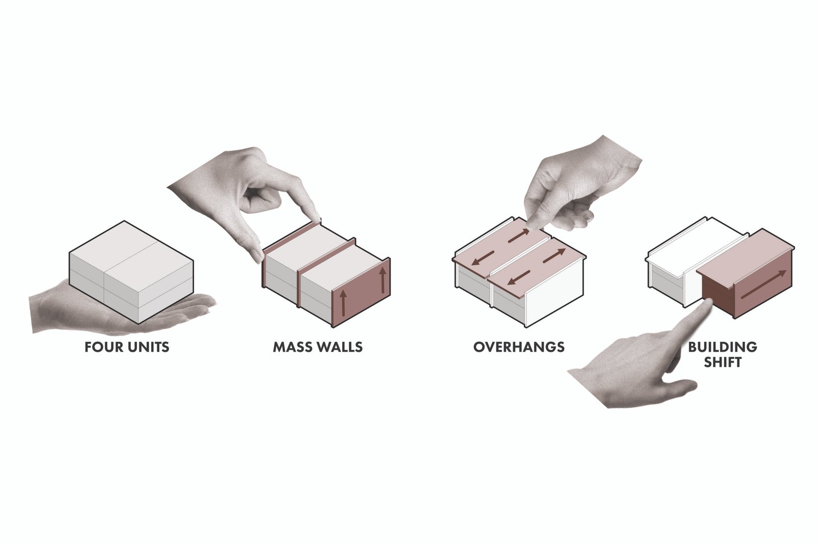 The project consists of a four-unit multi-family building with its adjacent private parking. Within each unit’s 920sqft are 2 bedrooms, 2 bathrooms, and an open living-dining space. The units at ground level have their own private patios, while the units at the second level have their own private balconies. Large windows line the northern and southern bedrooms, providing ample daylight. Each bathroom features tall, narrow windows screened by perforated steel panels, providing privacy and daylight simultaneously.