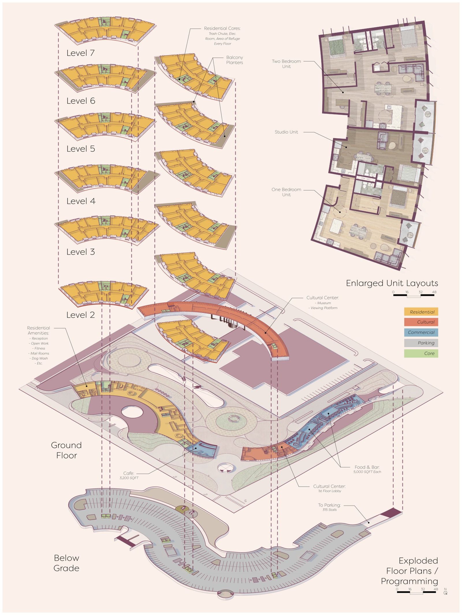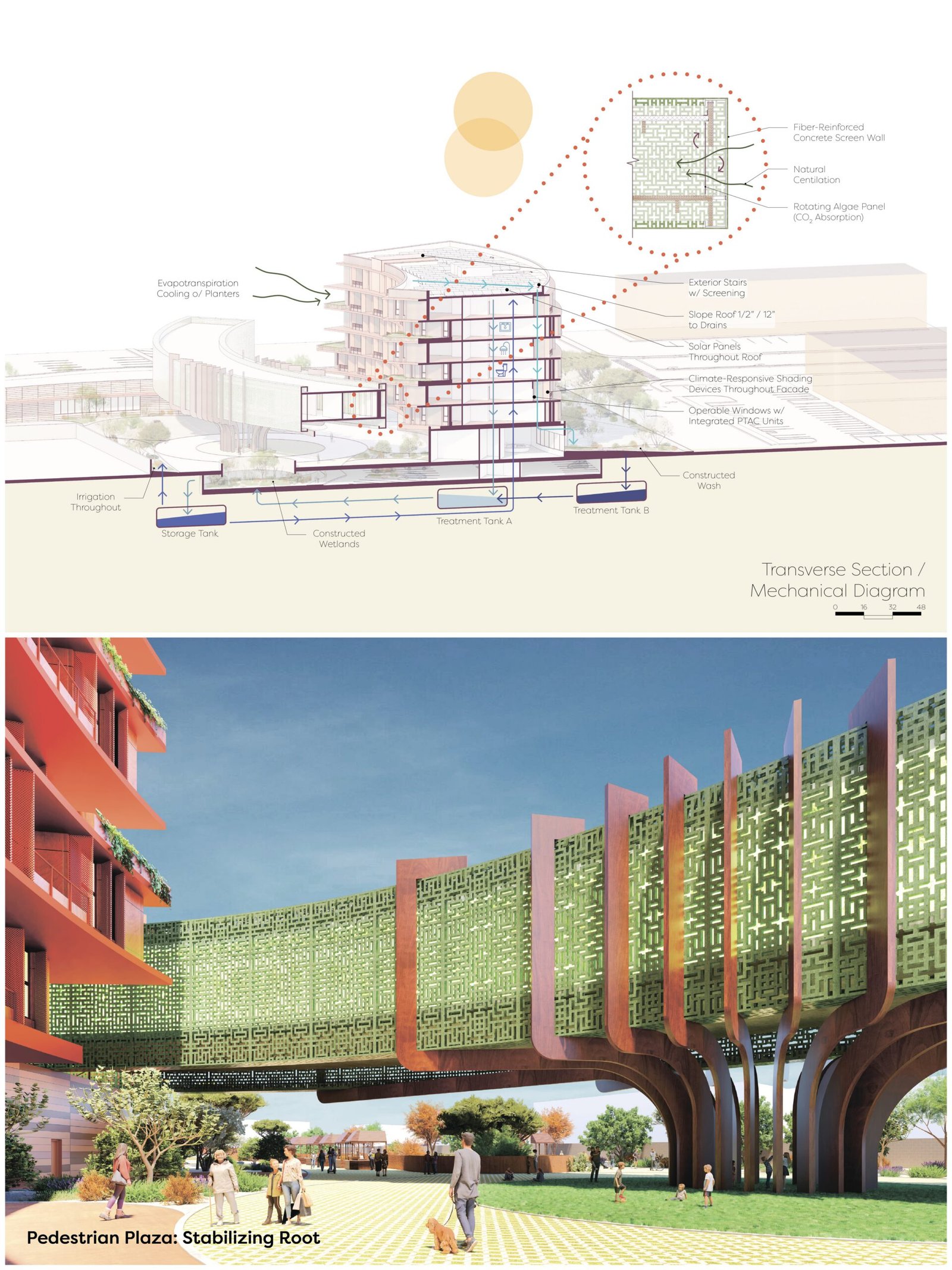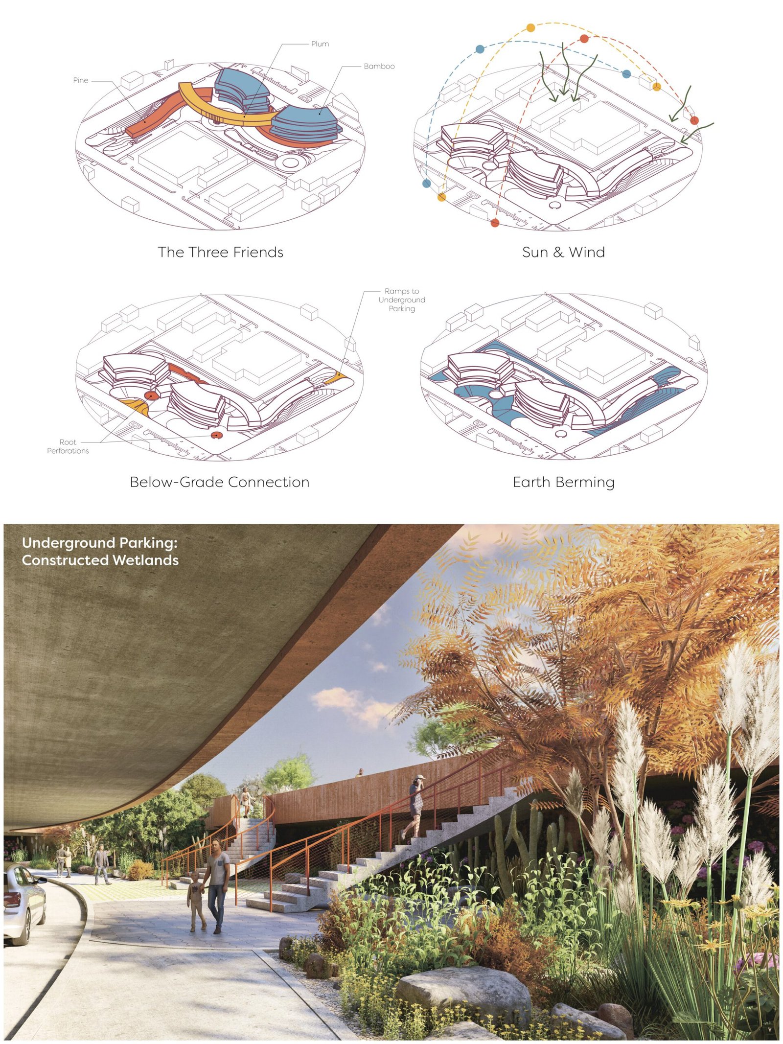 A cherished pan-Asian tale, the pine tree, bamboo, and plum blossom, symbolize resilience, unity, and perseverance. Known as the “Three Friends of Winter,” these plants endure the harshest seasons, reflecting the historical perseverance of the Asian diaspora amid systemic discrimination, forced labor, and cultural displacement. Drawing inspiration from the Three Friends, each plant informs a distinct component within this 5.5-acre, 203,000-square-foot mixed-use development. The pine, symbolizing fortitude and longevity, is reflected in the protected pedestrian plaza, a grounding space for gathering and reflection. Bamboo, known for flexibility and integrity, shapes the residential towers, rising resiliently above the plaza like a community that bends but does not break. The plum blossom, first to bloom after winter, represents hope and renewal, embodied in the cantilevered cultural center projecting toward the Spring Mountain range, offering expansive views and optimism. Connecting all three is the shared “root” system, an underground network of parking, site perforations, and bermed earth. Though unseen, these roots sustain life and continuity, guiding circulation and unifying the site. Ultimately, this project honors past strength, embraces present adaptability, and looks toward a future grounded in identity, community, and cultural resilience.
