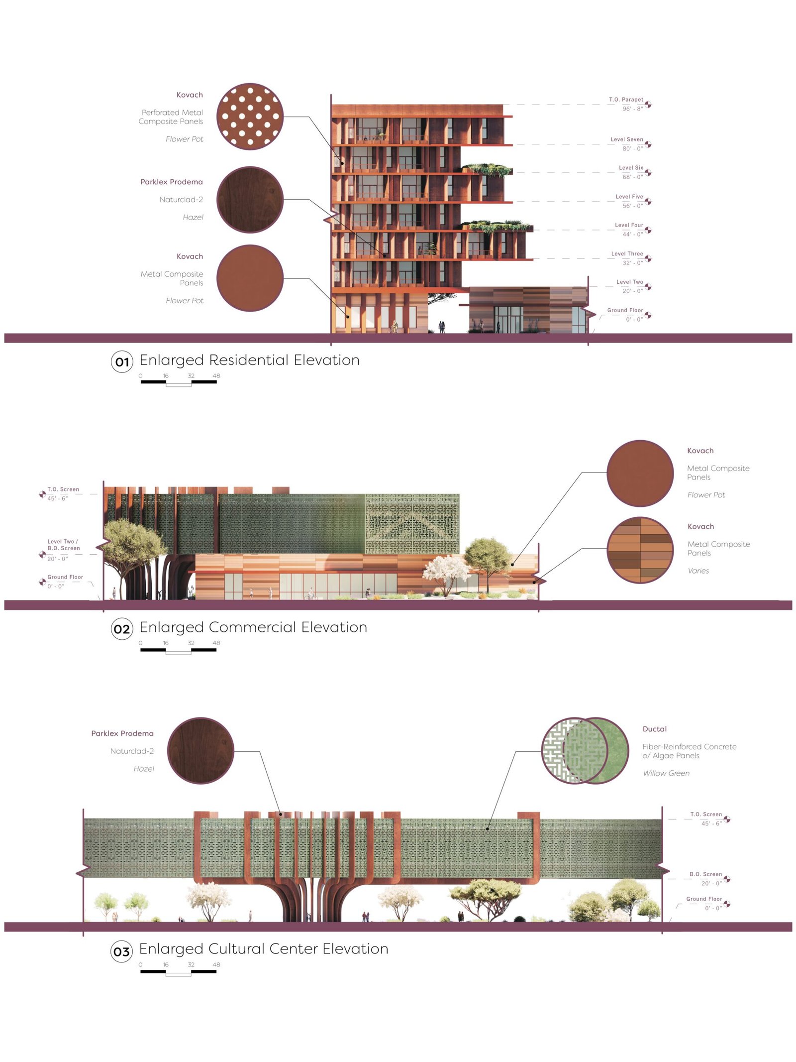 Sustainability and building performance are integral to the project’s design, shaping both form and function in response to the desert environment. The cultural center features a Ductal fiber-reinforced concrete screen wall inspired by traditional patterning, which reduces the need for steel reinforcement and offers greater longevity than conventional concrete. This screen wall also protects integrated algae panels that act as the Three Friends would, absorbing CO₂ while also emitting a soft, ambient glow. Water scarcity is addressed through a comprehensive reuse system with constructed wetlands and washes, capturing and recycling greywater from showers and sinks for irrigation. Below-grade drainage is supported by permeable bioswales that connect to these systems, creating a closed-loop network. Extracted earth is repurposed on-site to minimize embodied carbon and ground the project in its native landscape. Throughout the buildings, Kovach metal composite panels provide durable, high-performance facades that reflect solar heat while maintaining visual cohesion. Solar panels on each roof supply renewable energy, while operable windows and planter balconies act together to enhance ventilation and thermal comfort through evapotranspiration. Together, these strategies integrate performance-driven sustainability with the project’s cultural narrative.